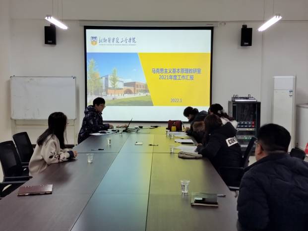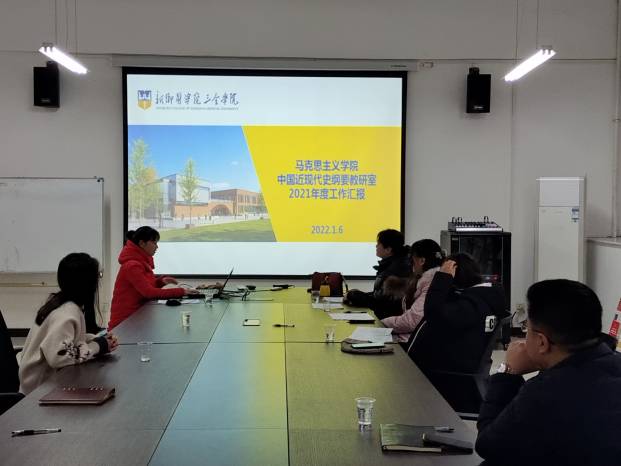 2022年1月6日,马克思主义学院在行政楼二楼会议室召开2021年度各教研室工作汇报会。毛泽东思想和中国特色社会主义理论体系概论教研室主任石霞、马克思主义基本原理教研室主任王桂琴、中国近现代史纲要教研室主任周慧,在考核工作汇报会上依据2021年各教研室工作情况进行了汇报。