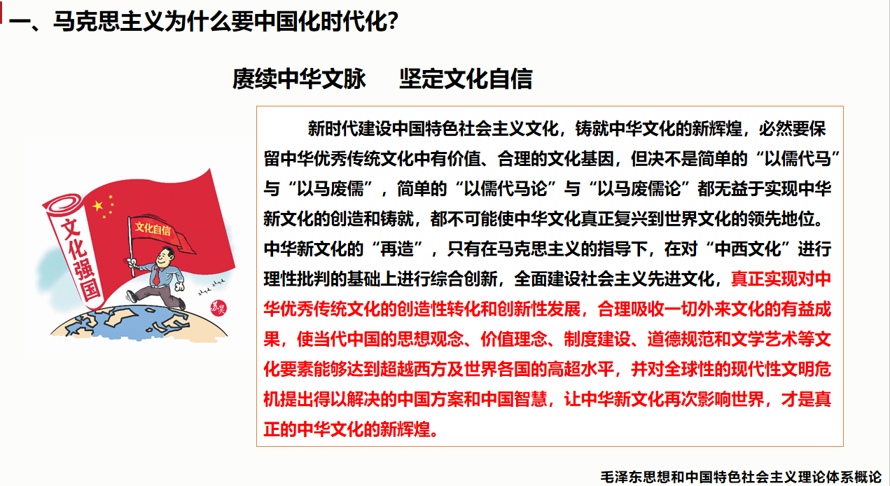文化是一个国家、一个民族的灵魂。文化兴则国运兴,文化强则民族强。毛泽东思想和中国特色社会主义理论体系概论教研室在本学期2023级《毛泽东思想和中国特色社会主义理论体系概论》授课中,结合课程教学内容,坚持把文化自信根植于年轻人心中。以马克思主义中国化时代的历史进程为切入点,讲清讲透“两个结合”,深刻理解中华优秀传统文化与马克思主义的内在契合,进一步坚定文化自信,上好“知”文化、“信”文化的思政第一课。