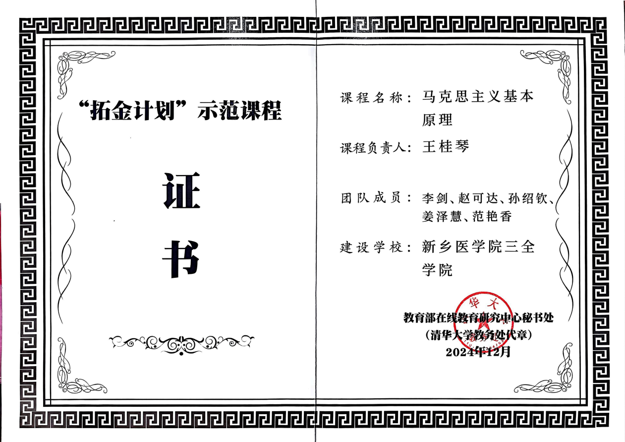 马克思主义学院一直以来高度重视课程建设和教学能力提升,成功入选“拓金计划”示范课程的2门课程是我院精品在线开放课程和一流课程建设的重要成果,对课程建设具有示范引领作用。马克思主义学院将持续推动信息技术与教育教学深度融合,加强课程建设的系统规划和长期培育,持续打造和提升教师教育教学创新能力,培育更多优质课程,用课程建设推动专业建设水平提高,不断提升人才培养质量。