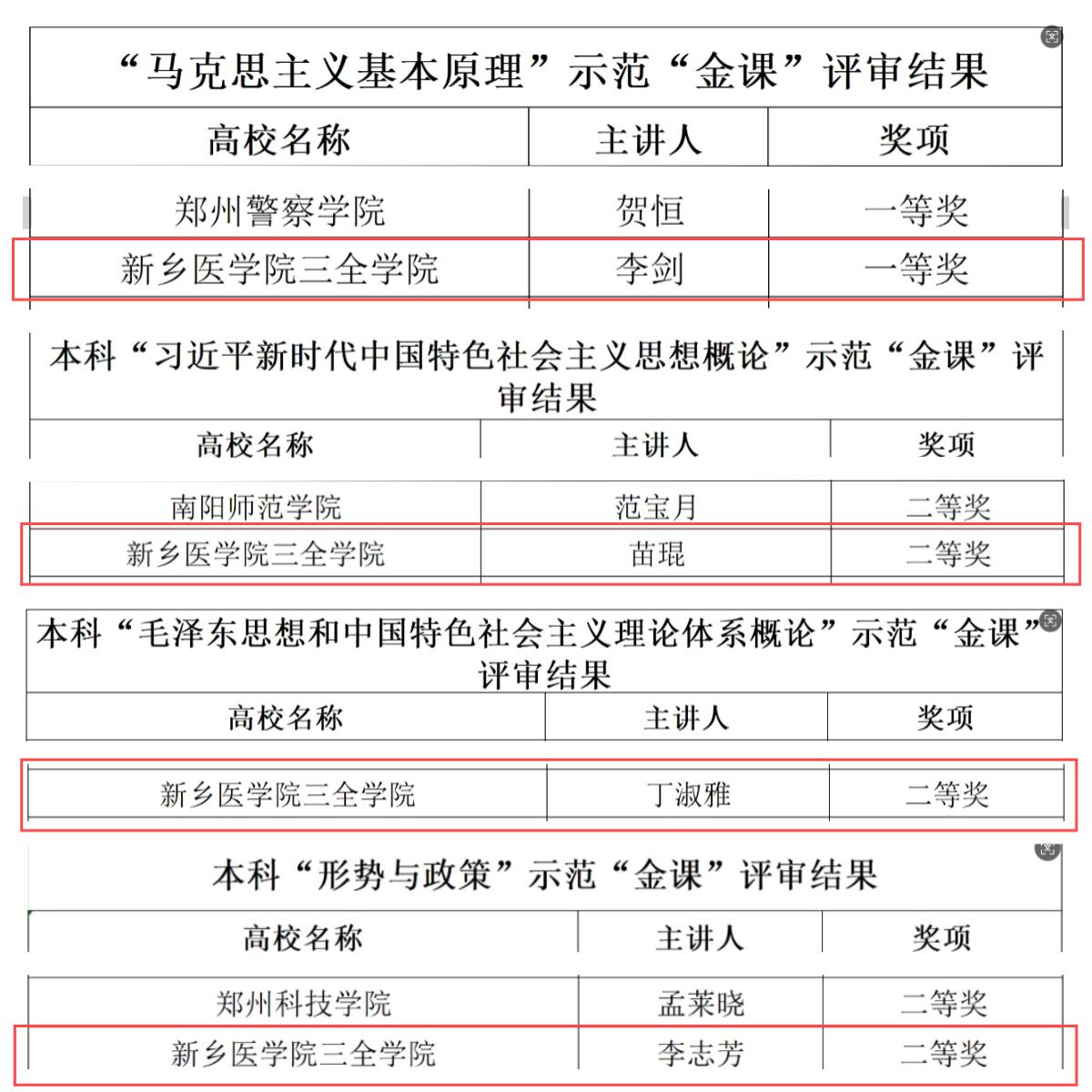 根据中共河南省委教育工委办公室、河南省教育厅办公室《关于开展高校思政课优秀课程资源评选工作的通知》(教思政函﹝2024﹞655号)要求,经各高校申报、资格审查、专家评审、综合评议等环节,一批优秀课程资源评审结果于近日公示。我校马克思主义学院共四位老师申报示范“金课”获奖。其中,李剑老师荣获本科“马克思主义基本原理”示范“金课”一等奖,苗琨老师荣获本科“习近平新时代中国特色社会主义思想概论”示范“金课”二等奖,丁淑雅老师荣获本科“毛泽东思想和中国特色社会主义理论体系概论”示范“金课”二等奖,李志芳老师荣获“形势与政策”示范“金课”二等奖。