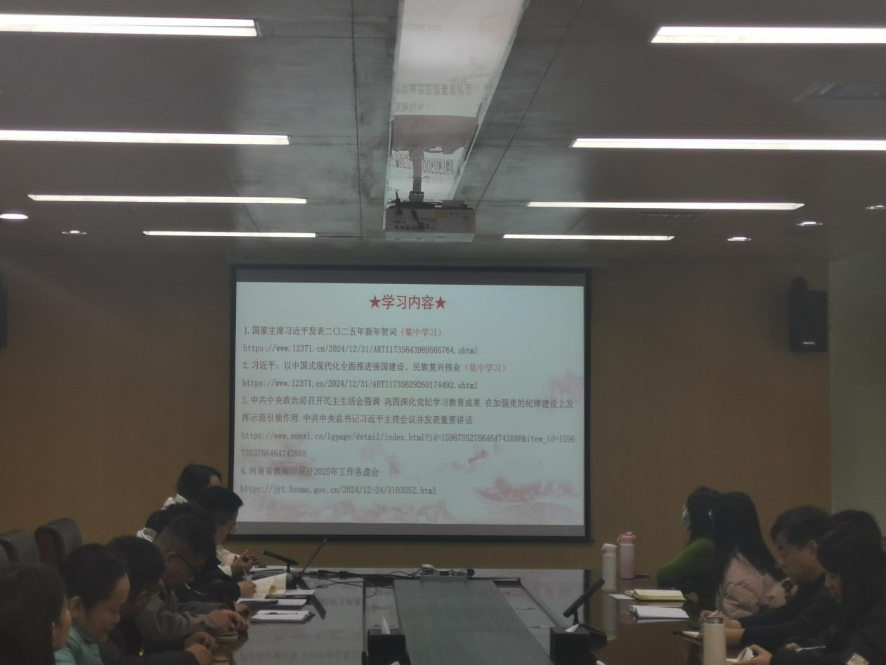 丁淑雅同志通报党员到会情况;何楠同志通报本月党费缴纳情况;并按学校主题党日活动通知要求,开展本月主题党日活动。通过“领学+研讨”的形式,范艳香以第一议题的形式领学了《国家主席习近平发表二〇二五年新年贺词》,《习近平:以中国式现代化全面推进强国建设、民族复兴伟业》,并由苗琨、周慧等党员同志进行学习感悟分享。此外,范艳香同志根据习近平在中共中央政治局民主生活会上的讲话讲授党纪学习专题党课。