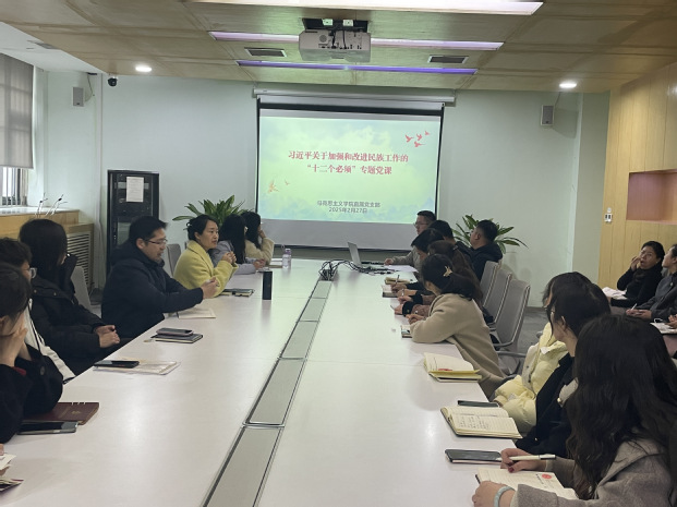 首先,何楠同志通报党员到会和本月党费交纳情况,并按照学校主题党日活动通知要求,开展本月主题党日活动。其次,通过“领学+研讨”的形式,范艳香以第一议题的形式领学了《国家主席习近平在二〇二五年春节团拜会上的讲话》《习近平在中共中央政治局第十五次集体学习时强调:贯彻落实新时代党的建设总要求 进一步健全全面从严治党体系》,并由陈豆豆、姜泽慧等党员同志进行学习感悟分享。第三,范艳香同志围绕习近平总书记关于加强和改进民族工作所提出的“十二个必须”讲授专题党课。最后,范艳香同志向支部全体党员传达2025年河南省政府工作报告会议精神。