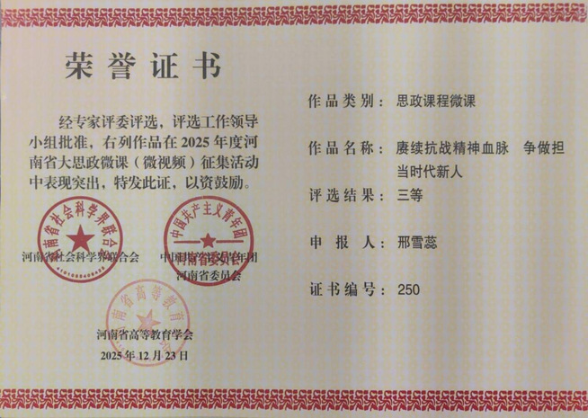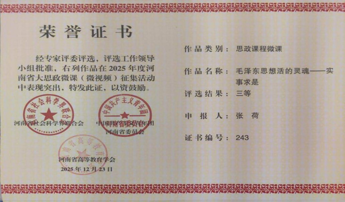 2025年12月23日,河南省社科联、共青团河南省委、河南省高等教育学会2025年度河南省大思政微课(微视频)征集活动评选结果公布,我院教师何爽爽荣获二等奖,教师赵可达、姜泽慧、邢雪蕊和张荷荣获三等奖。