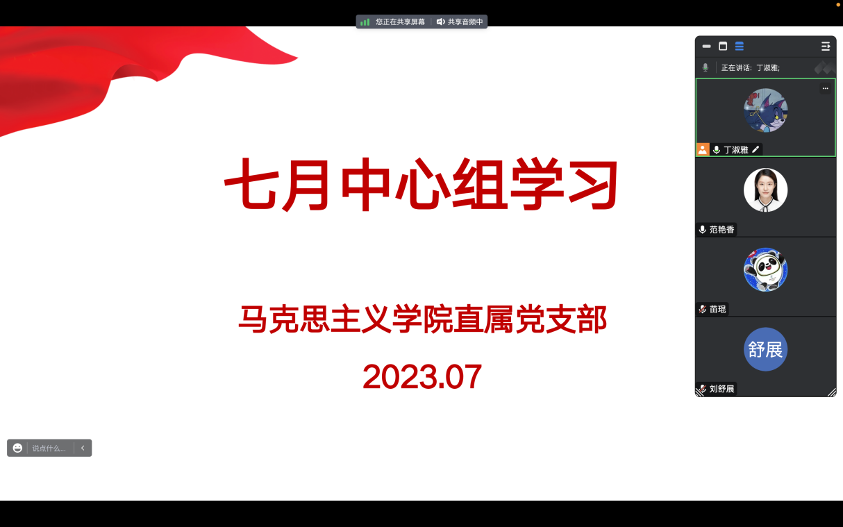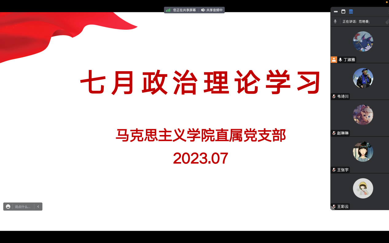 7月15日下午,马克思主义学院直属党支部政治理论学习中心组七月份政治理论学习于腾讯会议召开,本次学习采用“集中学习+研讨”的方式进行。会议由直属党支部副书记范艳香主持,中心组全体成员参加。