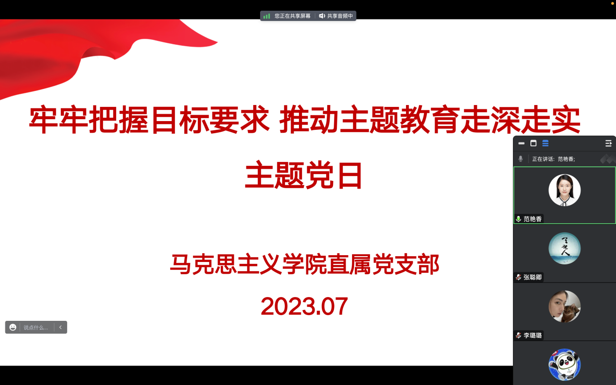 7月16日上午,马克思主义学院直属党支部开展了“牢牢把握目标要求 推动主题教育走深走实”的线上主题党日活动,会议由范艳香同志主持,马克思主义学院直属党支部全体教师党员参加。