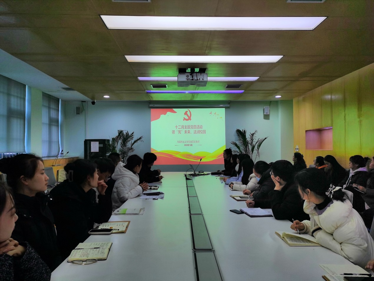 12月21日,马克思主义学院直属党支部开展了‘领“宪”未来,法润校园’的主题党日活动,会议在行政楼一楼第四会议室召开,由直属党支部副书记范艳香主持,马克思主义学院直属党支部全体教师党员参加。