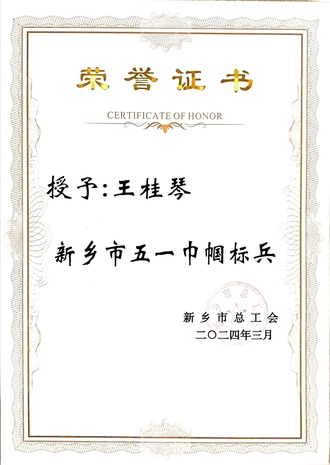 我院教师王桂琴荣获“新乡市五一巾帼标兵”称号