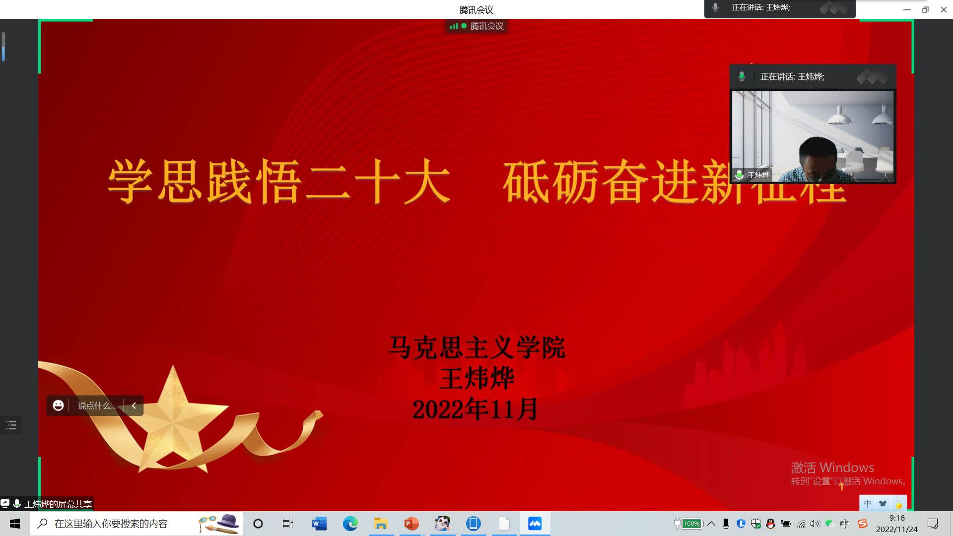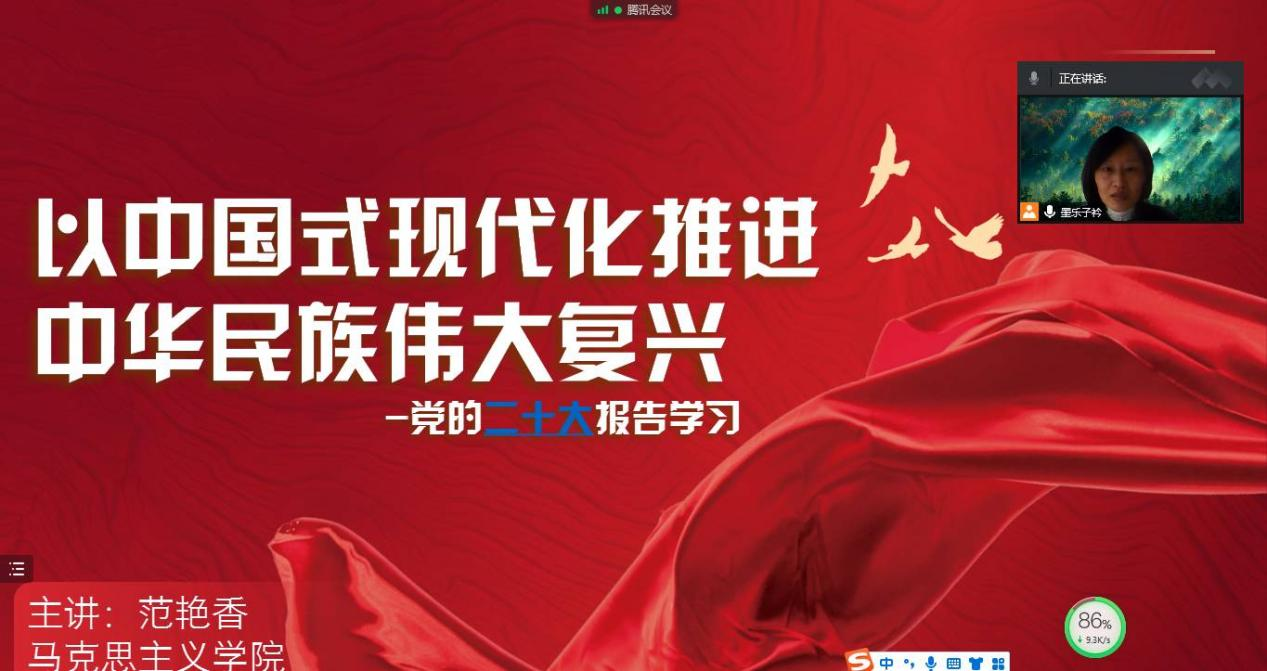 11月24日,马克思主义学院直属党支部在线上以腾讯会议的方式开展党课,马克思主义学院院长王炜烨同志为本次党课的主讲人,全体教师党员参加。王炜烨同志以“学思践悟二十大,砥砺奋进新征程”为主题,以党...